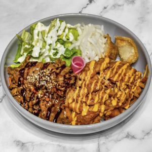 “Thin, marinated slices of beef, grilled on a stove-top griddle. w/ Rice”